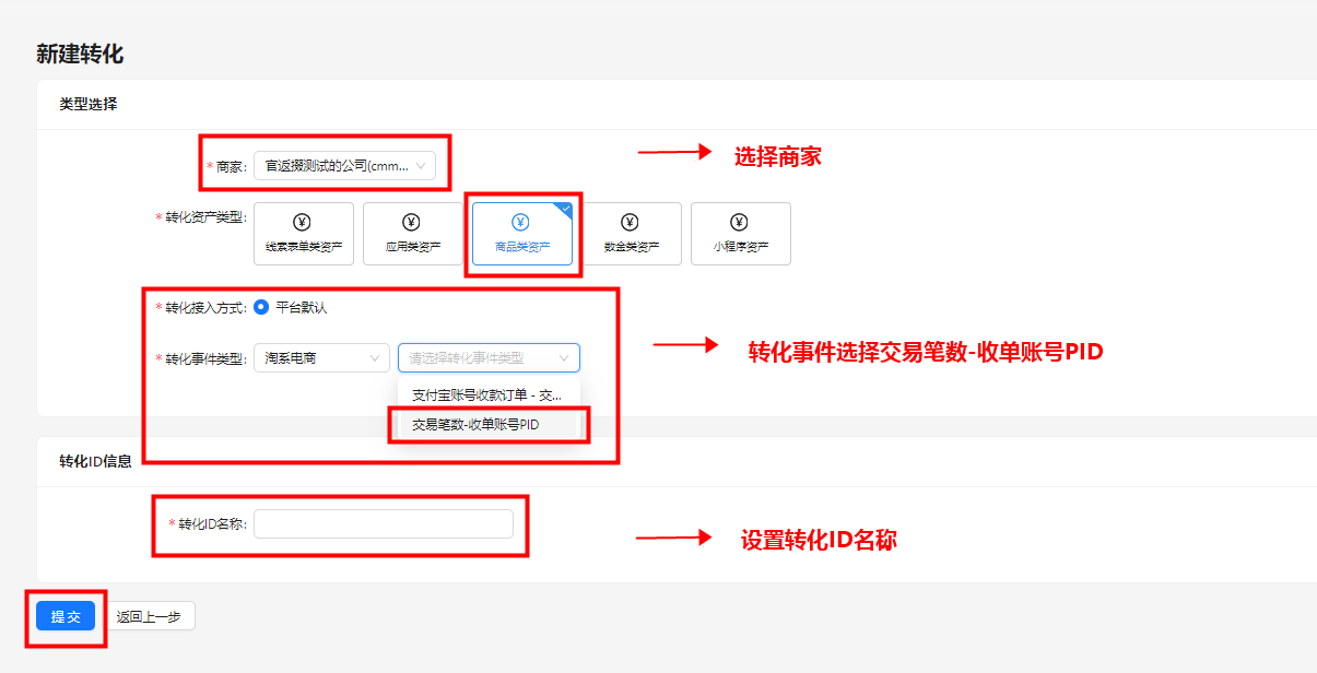 ③配置单元-选择事件:淘系电商-交易笔数-收单账号PID-转化ID
