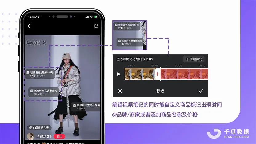除了图文笔记能够设置标记,视频笔记也能够设置标签出现时间。在视频中增加商品的标签,创作者可以通过拉长/移动进度条自主改变商品标签的出现时间。这样在视频笔记的过程中被种草,直接显示商品品牌和价格,链接到购买端口,用户可以边看边买,实现高效转化。