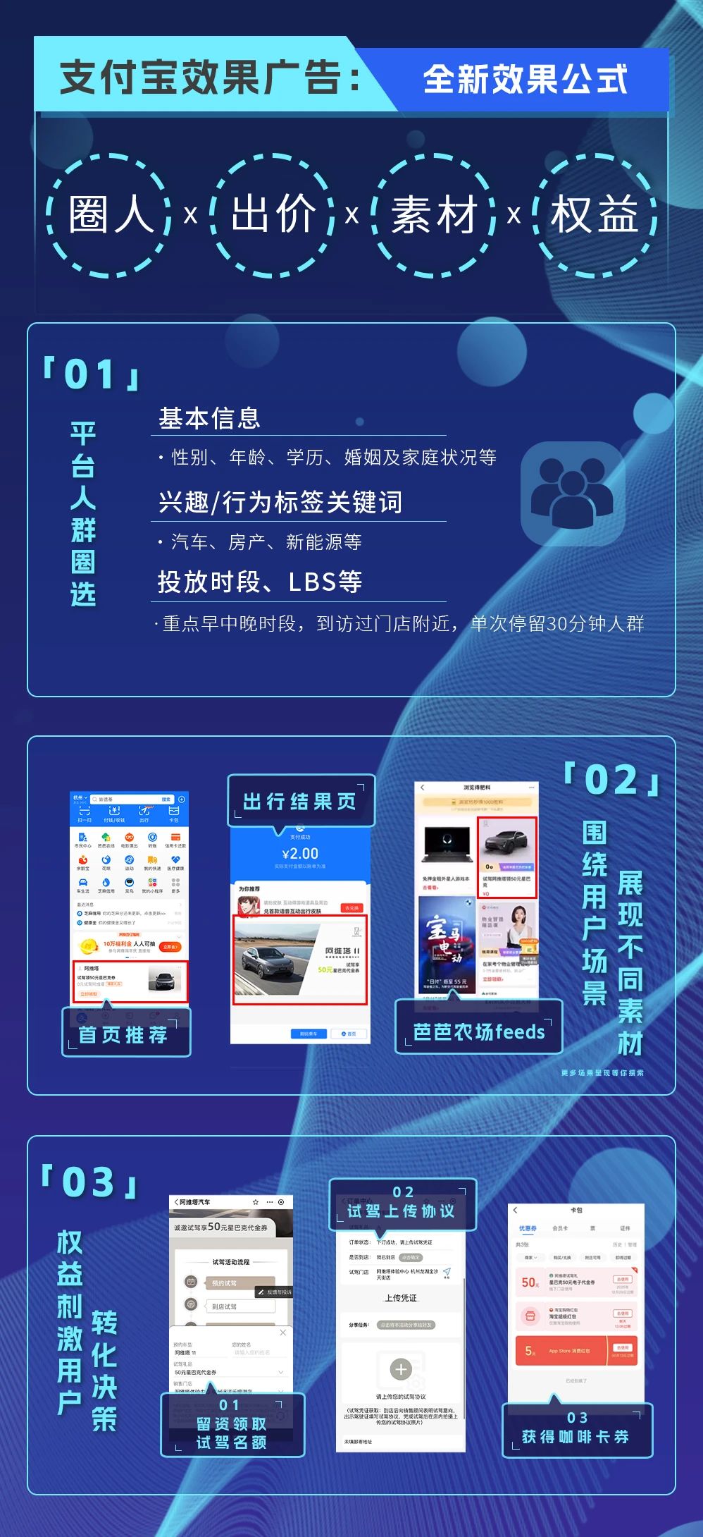 效果获客维度,支付宝全新效果广告公式增加「权益」,刺激用户更高效转化。